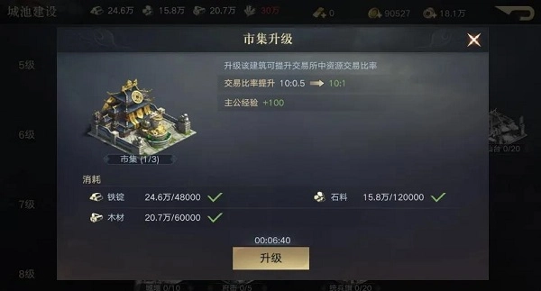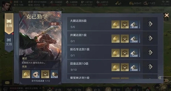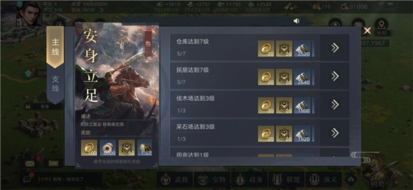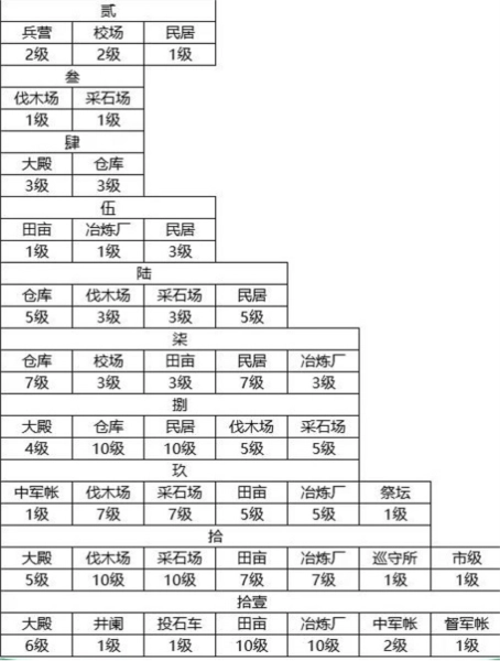 有些玩家或许已经留意到,前面表格里列出的事项,正是游戏主线要求完成的各项内容。只要跟着主线任务的指引去提升城市建设和科技水平,就能顺利将大殿升级到5级,之后再进行一次资源屯田操作,大殿就能升到6级并解锁井阑单位,这时就可以去尝试攻打5级资源地块了!