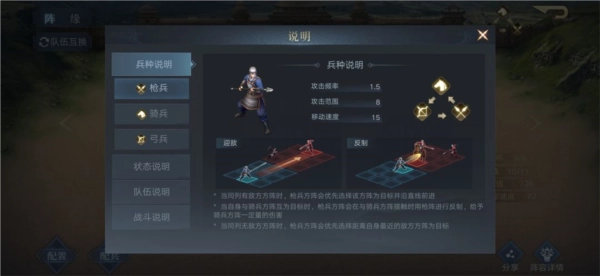 各位主公可在布阵界面查看兵种互克关系:骑兵克制弓兵,既能直切后排,也可攻击邻排最远敌军;枪兵克制骑兵,建议与敌方骑兵对位,若对位无敌军则会寻找最近的敌方部队;弓兵克制枪兵,作为后排输出需注意保护。