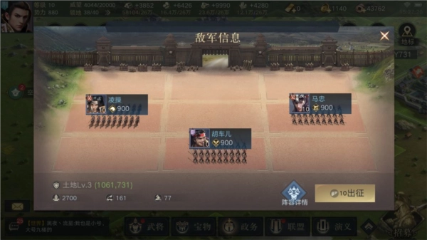 在推进游戏进程时,玩家可以尝试攻克更高级的领地。当自身兵力达到2700时,建议挑战驻守1800兵力的三级领地。为了帮助玩家合理规划资源,以下是不同等级领地的兵力建议:四级领地驻守7200兵力,推荐用3500兵力进攻;五级领地有12000兵力,建议派出5800兵力攻打;六级领地需要应对两队共21000兵力,推荐使用9500兵力;七级领地面临两队29000兵力的考验,建议派出17000兵力;八级领地有两队39600兵力,推荐用26000兵力挑战;九级领地的两队兵力高达49400,建议至少准备32000兵力再发起进攻。