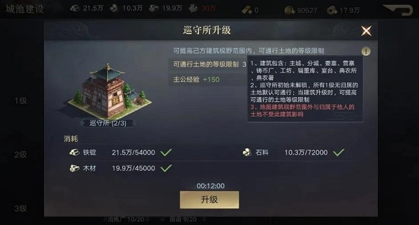 进入游戏后,优先升级主殿和必要的功能性建筑就足够了,在等级未达到5级前,巡守所可以暂时不进行升级操作。