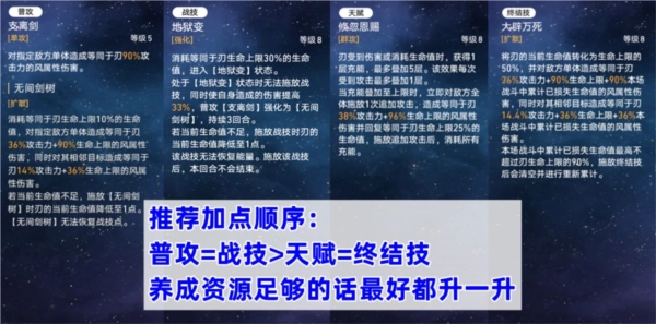 刃的技能加点建议优先提升普攻与战技,二者优先级并列且高于天赋和终结技。尽管他的核心输出依赖强化普攻,但实战中终结技与天赋触发的追加攻击也能贡献可观的伤害份额。因此,若培养资源充足,建议尽可能将这四项技能的等级都往上提升。