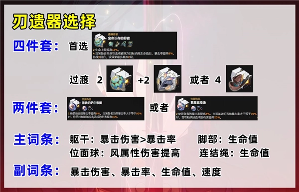 关于刃的遗器词条搭配,主词条推荐如下:躯干位置首选暴击伤害,次选暴击率——毕竟专属光锥、行迹加成以及遗器套装效果本身就能提供相当可观的暴击属性;脚部位置建议选择生命值加成;位面球则优先风属性伤害提高;连结绳同样推荐生命值加成。尽管刃的伤害同时受生命值和攻击力的双重影响,但从收益来看,堆叠生命值的效果会更明显。副词条方面,优先追求暴击伤害、暴击率、生命值与速度这几项属性。