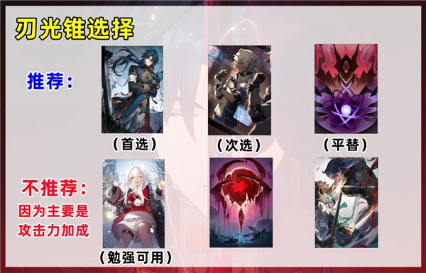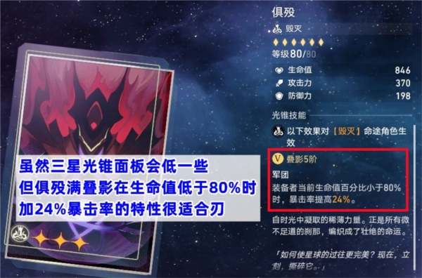 要是既没有崩坏星穹铁道的专属光锥,也没拿到秘密誓心,个人比较推荐选三星光锥俱殁。虽说它的面板数值会稍低一点,但叠影拉满后,当生命值低于80%时能增加24%暴击率的特性,和刃的适配度是相当高的。