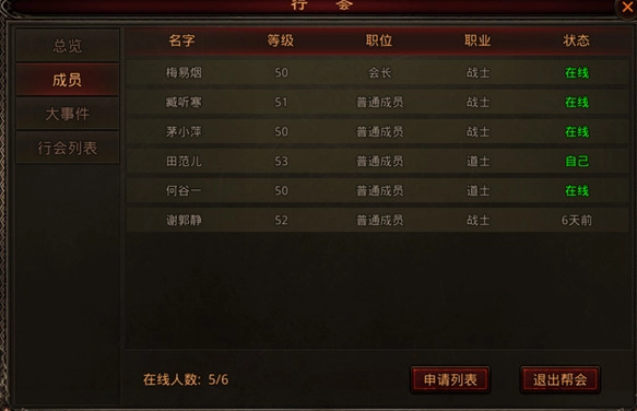 在行会成员管理界面,能浏览并调整行会成员信息。点击成员列表中的玩家头像或名字,可执行查看资料、发起私聊等操作;若你是行会会长,还能对该玩家进行移出会籍、调整职位等管理操作。此外,退出当前行会的功能入口也位于此界面。