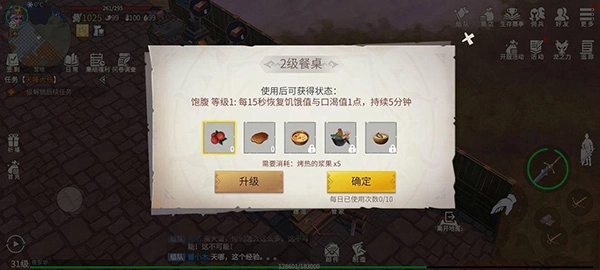第三个解锁的是餐桌台。现阶段它的实用性不高,每15秒只能少量恢复饱食度和水分,作用微乎其微,但后续或许会有更实用的功能。