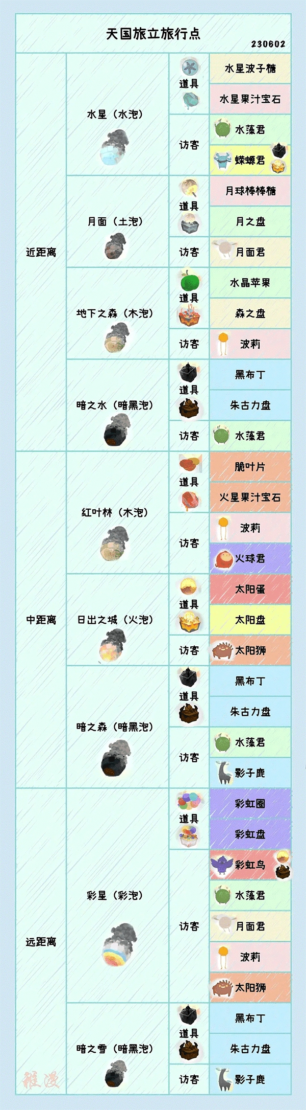 能和来访客人进行互换的物品,都用同一种颜色做了标记,而蝾螈君与彩虹鸟这两样则单独列出来了。