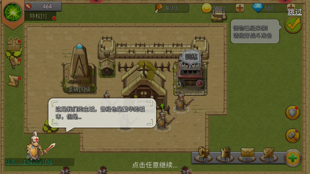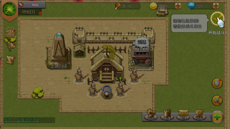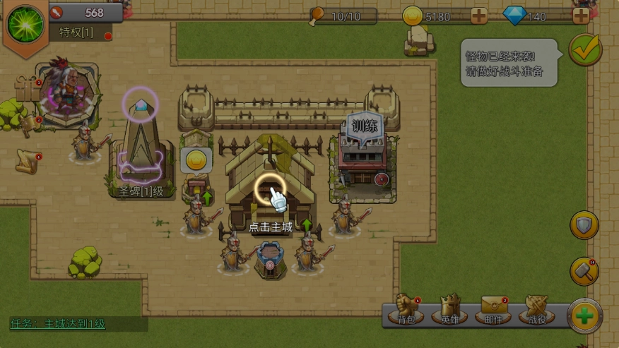 最后,提升城堡等级可以建造更多防御建筑,从而增强城市的防御能力。首先需要将主城升级一次,点击【主城】,这需要花费1000块钱。