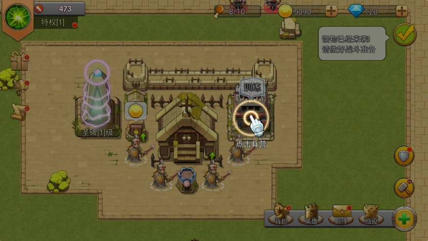 要成功阻挡敌人,除了采用上述操作方法外,玩家还需组建一支实力强劲的队伍。具体操作如图所示:点击兵营,接着点击士兵就能启动训练流程。