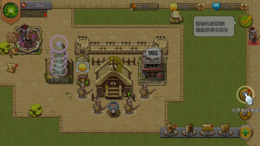 和常规的传统塔防不一样,在这个游戏里敌人可能从四面八方发起进攻,要是想成功拦截敌人,就得在战力布置上多花心思,打开【布阵界面】,接着把士兵放到画面里。