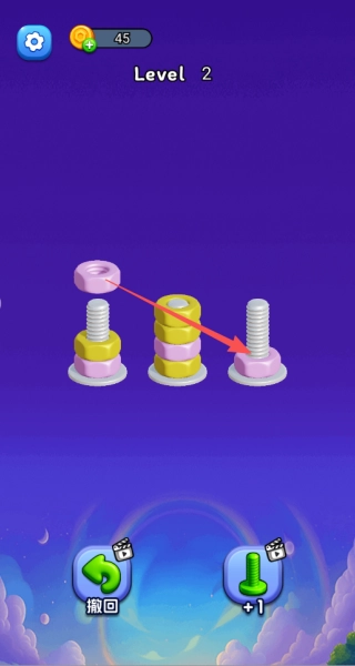 进入第一关,只要把相同的螺丝放置到同一根螺丝钉上就能通关啦。