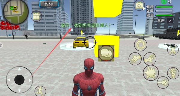 进入游戏后,通过滑动左侧的虚拟摇杆来操控角色移动,目标是找到坦克或者机器人。