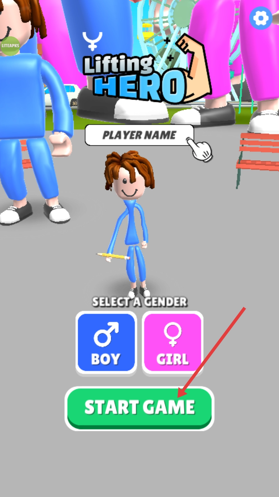 进入【Lifting-Hero】游戏,点击【START-GAME】按钮开始,选好性别后,就能开启一场充满挑战的肌肉锻炼冒险之旅啦。