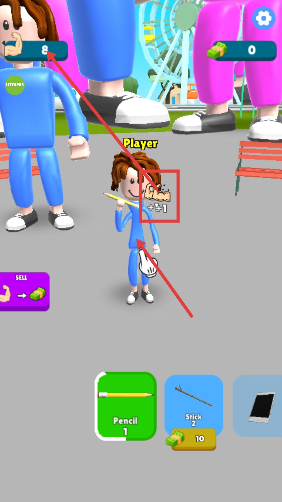 在游戏里点击角色来提升肌肉量,留意左上角显示的【+1+1】反馈提示,通过持续进行这样的操作来积累肌肉数值,以此为后续的发展打下基础。