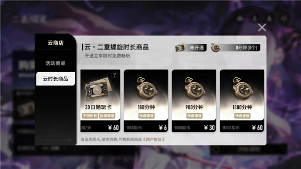 - 9000点旋币 = 15小时,售价30元