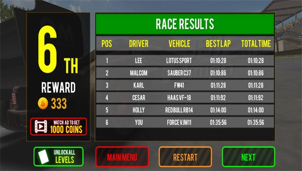 比赛结束后,进入结算界面,瞧瞧你的名次怎样?有没有获得丰厚的奖励呀?快来展示你的赛车技术吧!