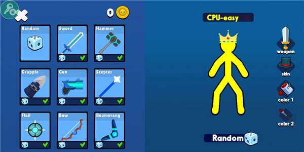游戏开始前,可对火柴人的皮肤和装备进行设置,点击屏幕右侧就能操作。