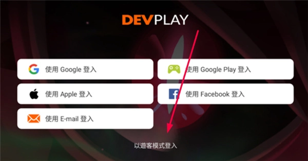 进入登录界面后,能看到谷歌账号、facebook账号等几种不同的登录途径,而其中最便捷的当属下方的游客模式。