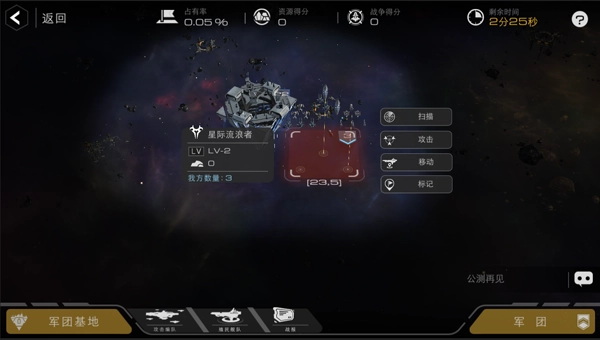 我们留意到空间机库左下方新增了几个阵型按钮,不妨先选用1号阵型,在前三个位置布置肉盾,后三个位置安排输出。完成编队配置后就能启动进攻,点击空白地块会展示该地块的详情,我们先将编队移动过去,抵达目标点后即可点击发起攻击。