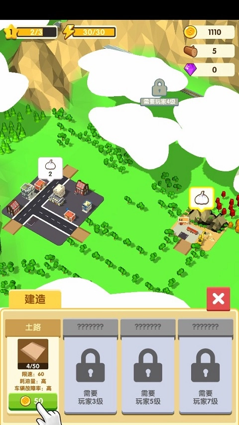 城市升星过程中需要用到建筑材料,玩家只需点击地图上的绿色树木进行砍伐,当砍伐达到一定数量时,树木会被清理掉,同时还能获取建筑材料。后续进行道路建设时,也需要通过类似的操作来清除各类阻碍。