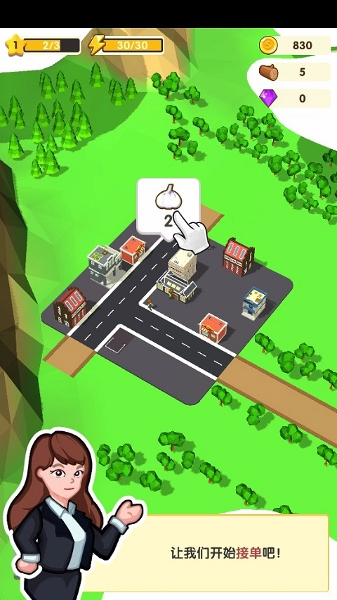 道路修缮完成后,就可以开始接收订单了!就像图中展示的那样,在城市区域内点击“气泡”就能选定订单,一旦你选好订单,系统会自动匹配城市里可调配的车辆来完成运输任务。