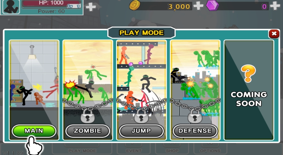 3、游戏初始阶段有九个火柴人共同参与战斗,同时提供两种模式供玩家挑选;