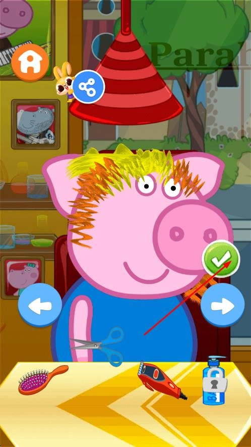 1. 进入游戏之后,在小猪佩奇等角色客人中进行选择,点击造型工具以了解客人需求,接着拖动发剪,着手修剪基础发型。