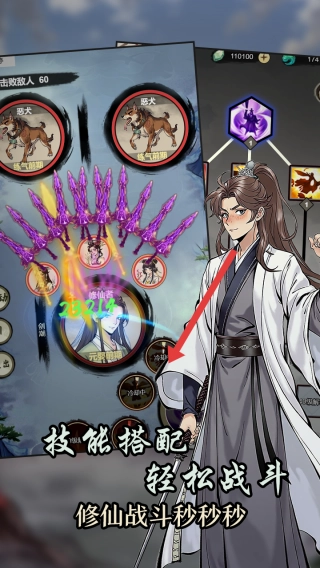 进入战斗技能配置阶段,从技能库中挑选各类技能,比如紫色剑阵这种强力技能,组合上阵。战斗时,根据敌方阵容(如恶犬之类),便能轻松击败敌人,感受修仙战斗的策略性与畅快体验。
