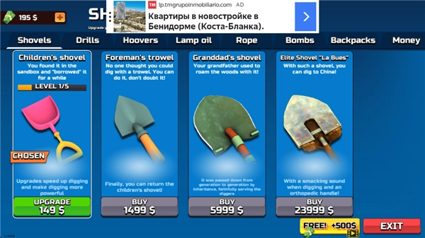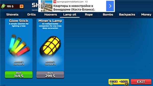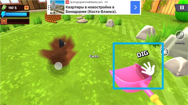 玩家2:靠在土地中挖取财宝来积累自己的资金,并且能用这些攒下的钱升级挖掘工具。