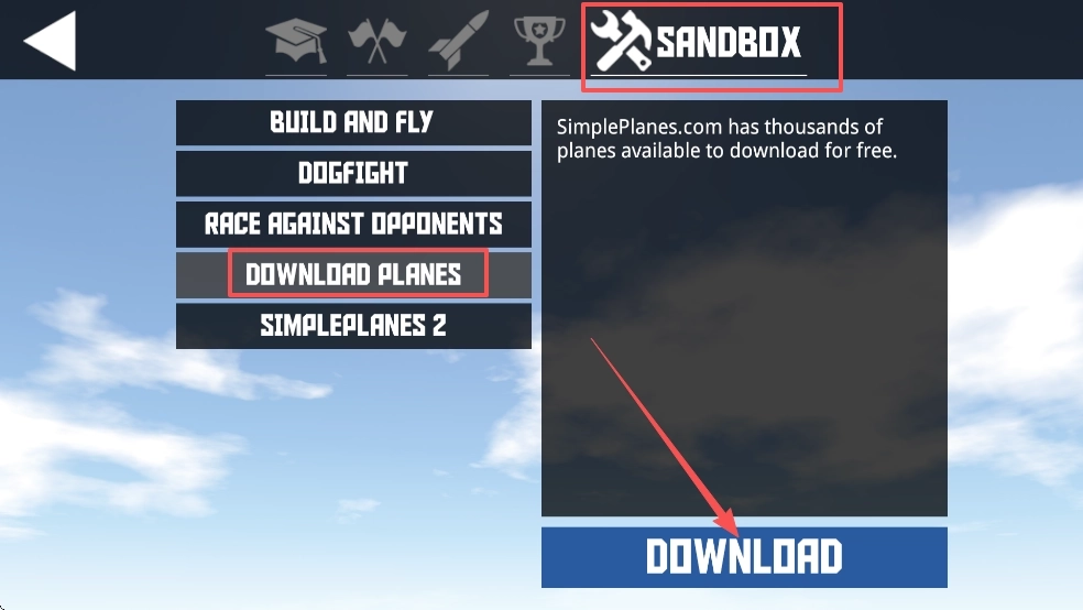 2、接着点击Sandbox,再选择DOWNLOADPLANES选项。