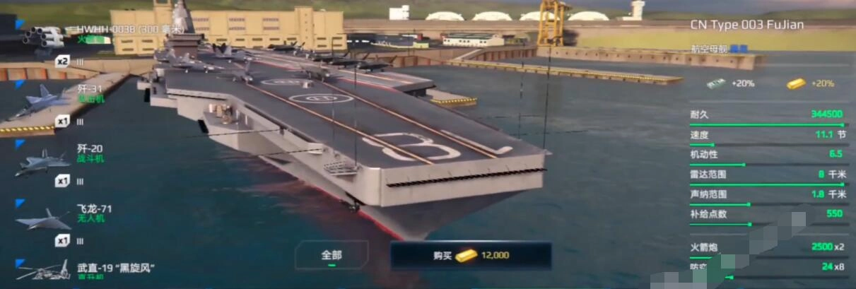 福建舰搭载4座改进型1130近防炮和4座24联装海红旗-10防空导弹可以让你成为弹幕+导弹双重拦截的顶级海上堡垒。主武器推荐搭配鹰击-18反舰导弹(射程远)和鱼-8反潜火箭弹,直升机必选直-19(反潜侦查)。开局优先升级近防炮射速和导弹装填。