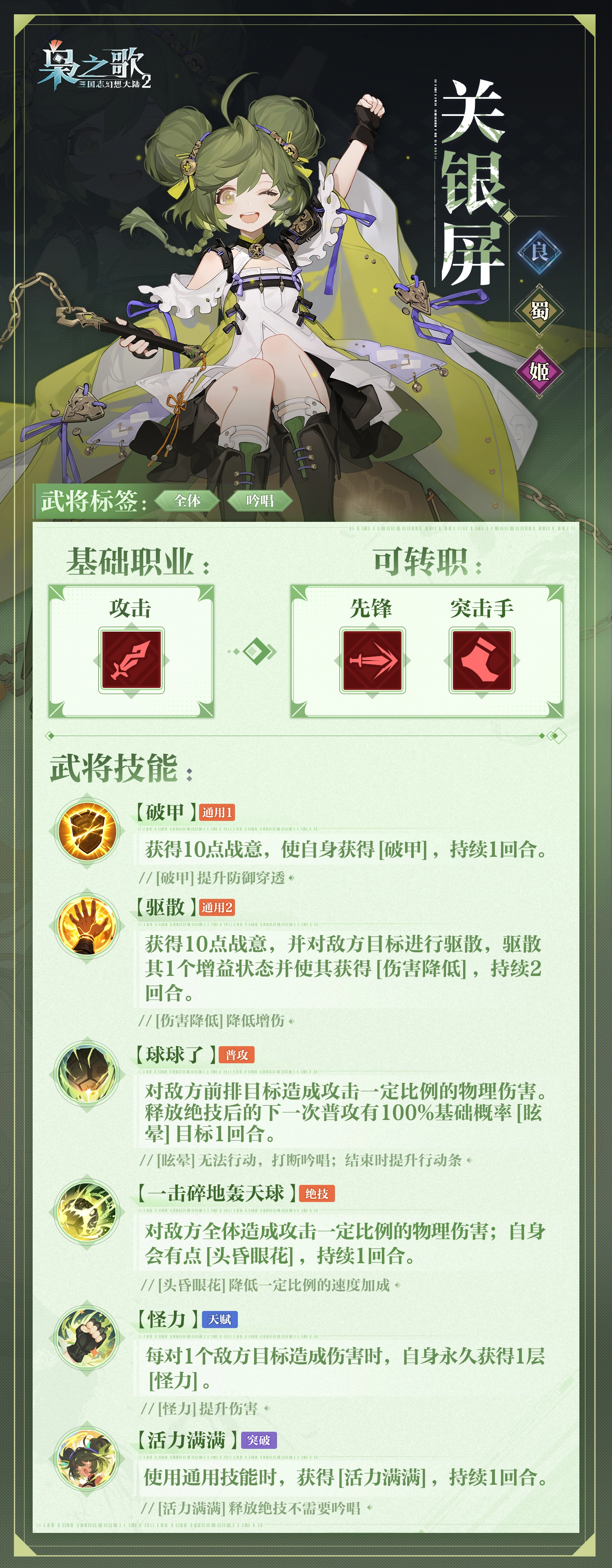 在由百万文字精心构筑的剧情里,你能目睹一个个鲜活的人物,他们以生命与理想奏响壮丽的挽歌。《三国志幻想大陆2:枭之歌》不再拘泥于传统卡牌的限制,多方向的转职设定、更为自由的羁绊搭配,让你能够淋漓尽致地展现自身的策略才华。下面,就由小编为大家带来详尽的《三国志幻想大陆2:枭之歌》关银屏角色介绍!