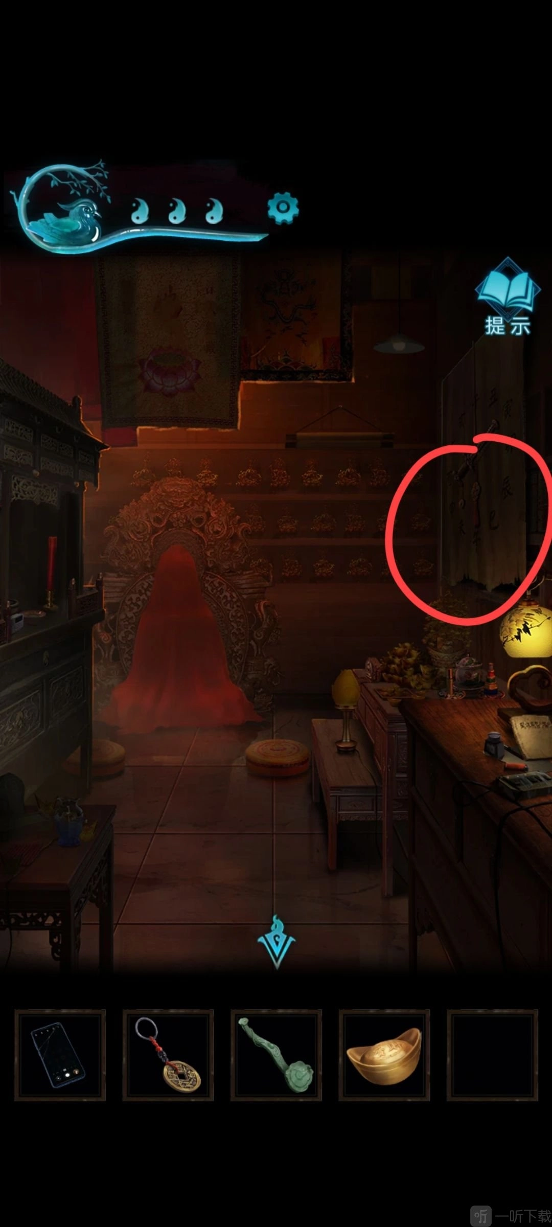 回石门拿箱子卡主石门,把贴画贴在最里面的红贴纸旁边,把珍珠耳环扎在右上角的洞上,拿到阴阳玉。