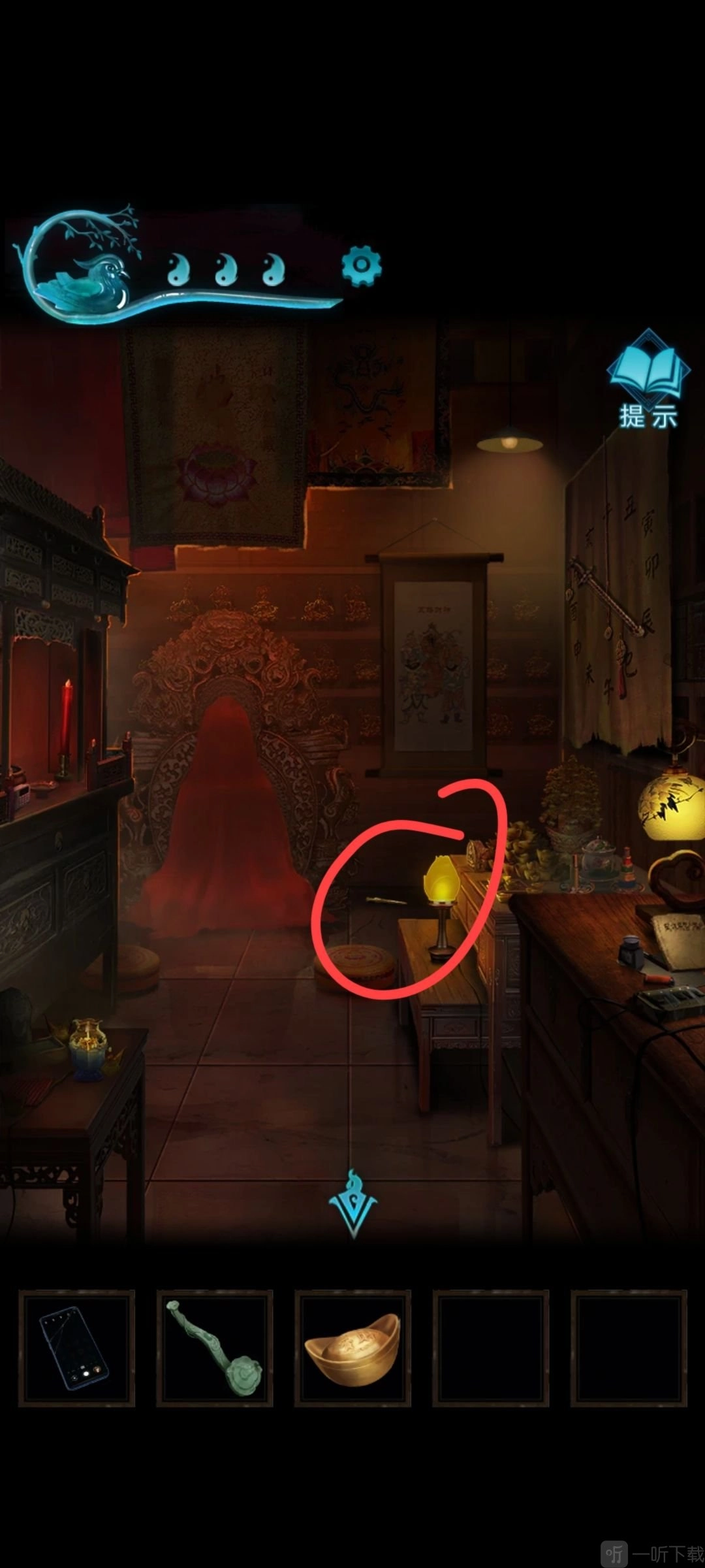 9、之后来到易寿堂旁边的屋里,六宝阁, 进去后关掉桌子上的电源,之后电源旁边有打火机,记得看那个电源旁边的书
