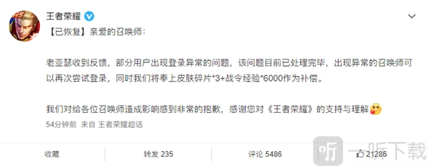 仅仅过了半小时,@王者荣耀官微便发布消息表示:此问题现已处理完成,遇到异常情况的召唤师能够再次尝试登录游戏,与此同时,我们会送上皮肤碎片*3 以及战令经验*6000 作为补偿。