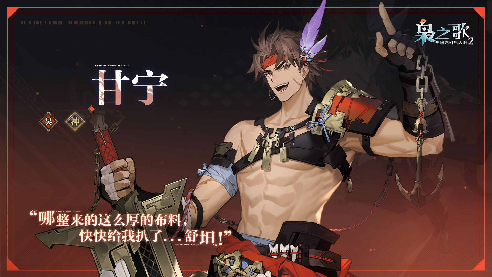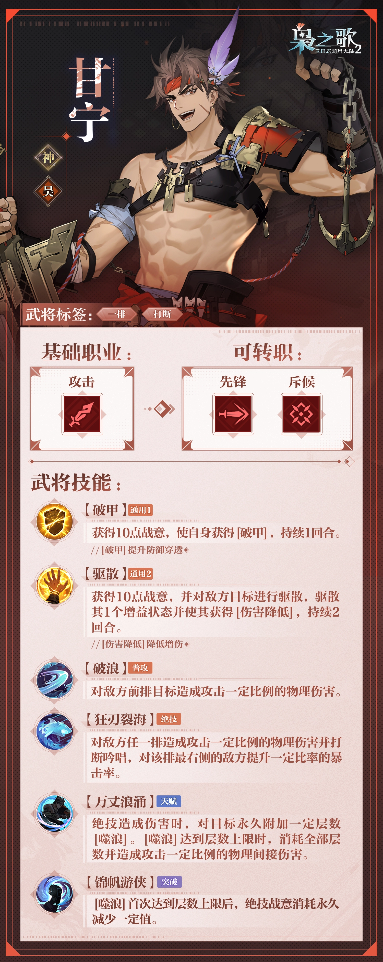 在百万文字精心构筑的剧情里,邂逅那些栩栩如生的人物,他们以生命与理想奏响激昂的壮丽挽歌。摆脱传统卡牌玩法的桎梏,多维度的转职路径、更具自由度的羁绊组合,让你充分施展自身的策略天赋。下面,就由小编为大家呈上详细的《三国志幻想大陆2:枭之歌》甘宁角色介绍!