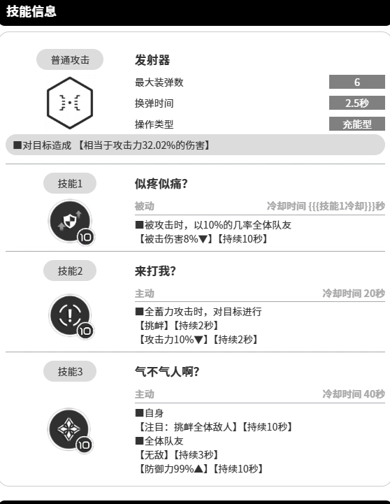 此刻,她会向目标发起挑衅,该挑衅效果能维持2秒。与此同时,她自身攻击力提升10%,此提升效果同样持续2秒。在团队作战里,借助这一技能的挑衅,能巧妙地把敌方目标的攻击火力汇聚到自己身上,进而为团队中的输出角色创造出适宜当下输出的环境。要是想更稳妥些,她自身攻击力的提升效果也能带来助力。当然,在她吸引火力之际,队友务必抓住反击时机,如此方能对敌方达成攻防一体的成效。
