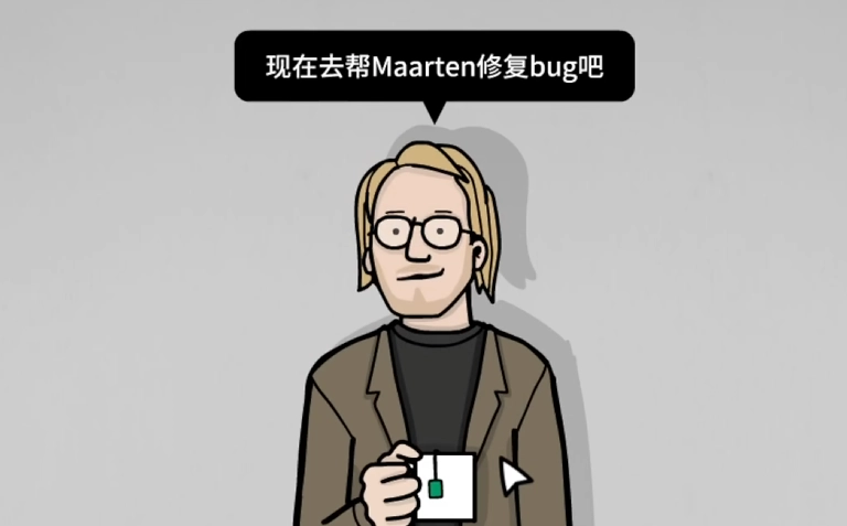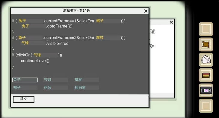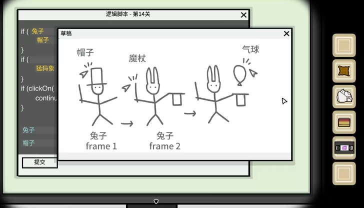 剧情发展至此,小伙伴们会瞧见右边的 npc 正向你招手,还邀请你帮他修复 bug 。玩家只要点击他身旁的显示器,屏幕上就会出现“逻辑脚本”的字样,同时还会出现一篇草稿,而这篇草稿里的内容便是玩家完成这部分的关键所在。首先,.currentFrame 用于判断当前的 frame id ,所以在这个空格处,玩家能填入的唯有兔子。