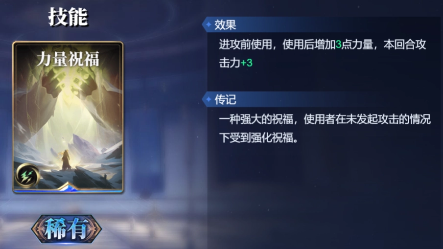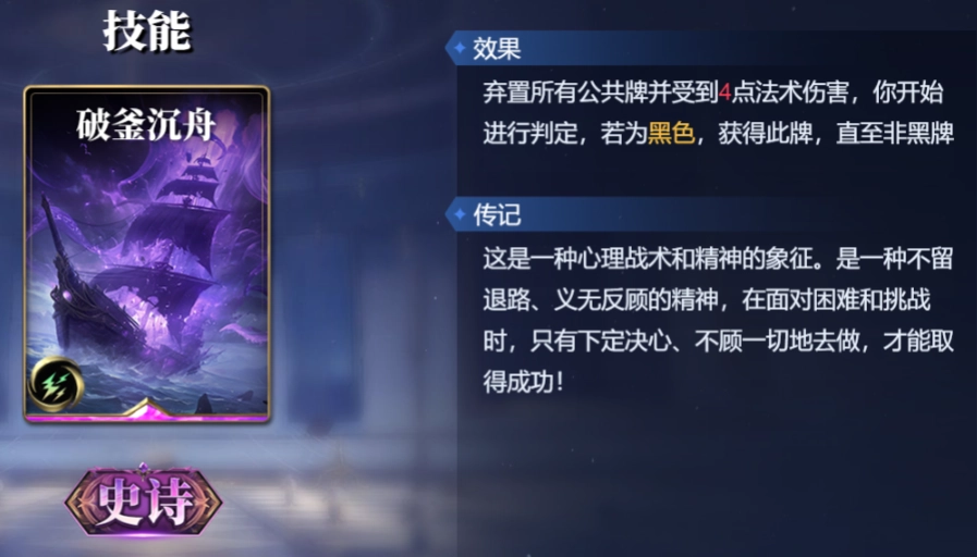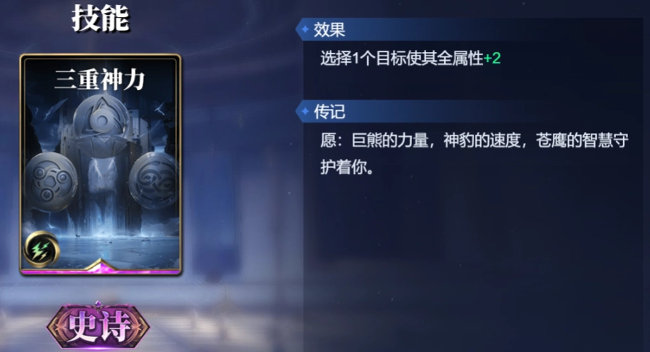 舍弃2张公共牌,对1名其他对象造成3点法术伤害。若你的力量与速度总和大于该对象,额外再造成3点法术伤害,此效果限用2次。
