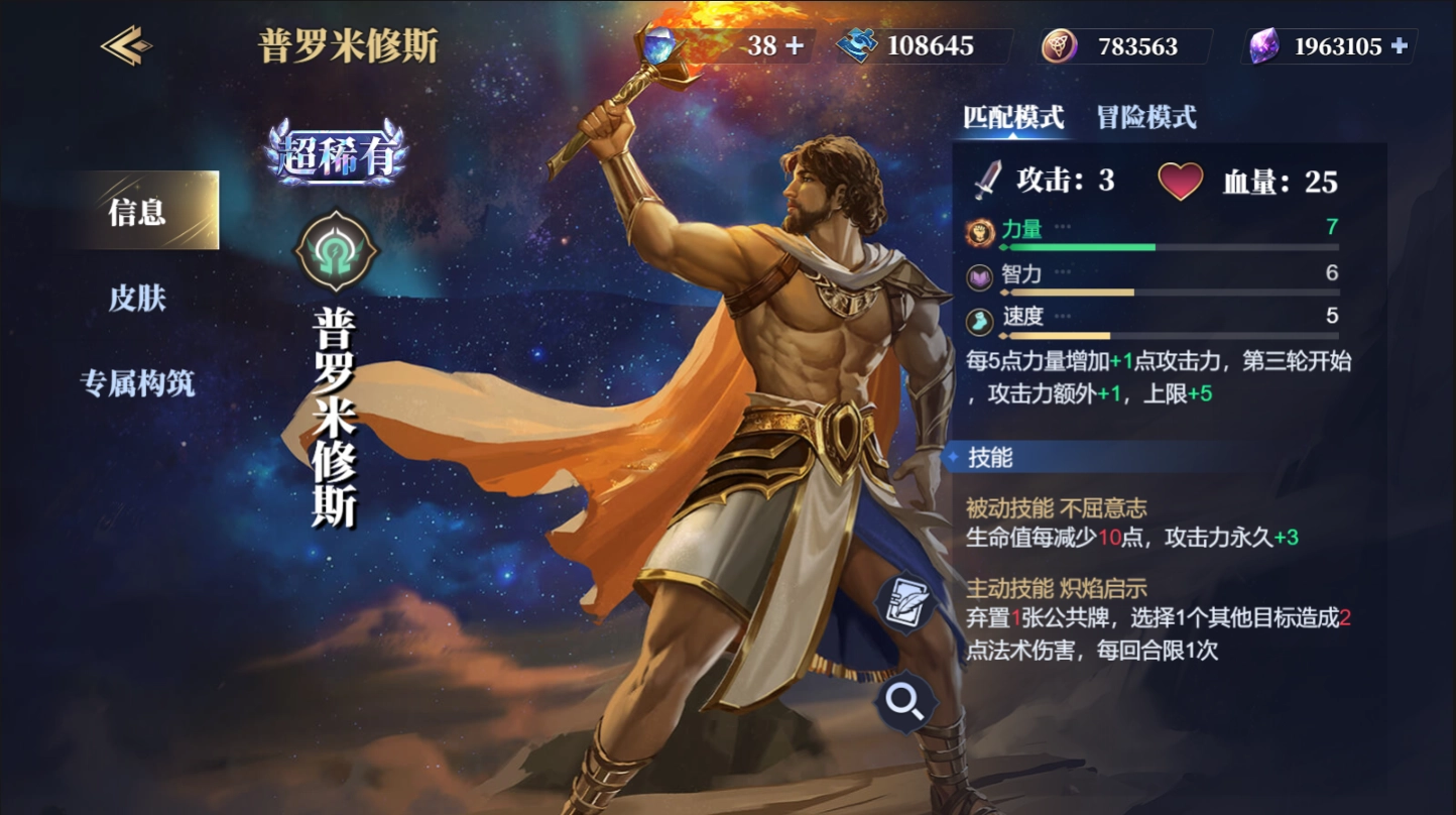 普罗米修斯,初始攻击力3点,25血量,力智速初始三维为7/6/5