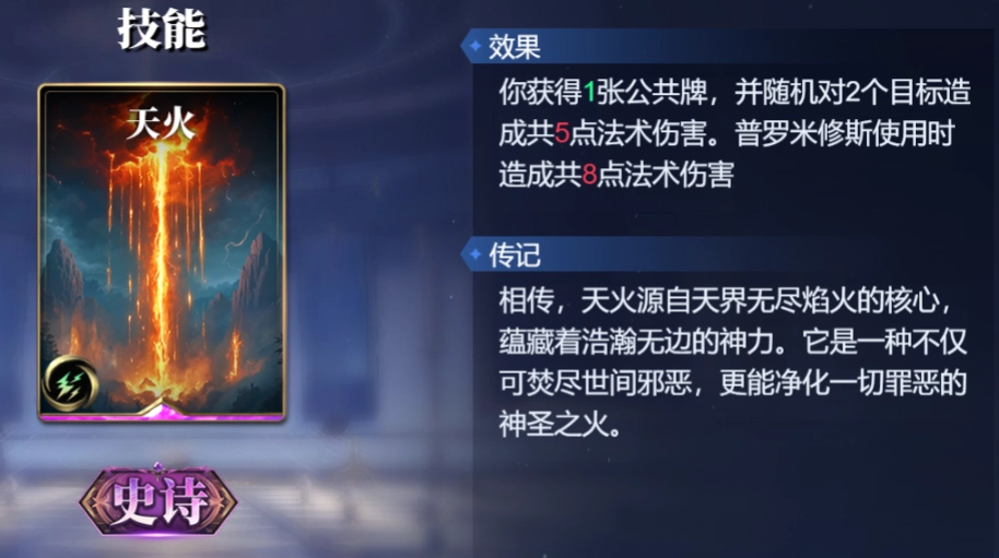 天火,使用后获得1张公共牌,并随机对2个目标造成共5点法术伤害。普罗米修斯使用时,造成共8点法术伤害。