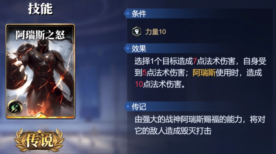 阿瑞斯之怒,对对手造成7点法术伤害,自己受到5点法术伤害。