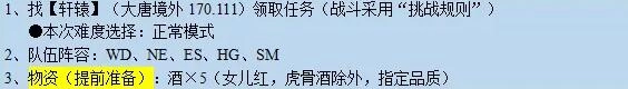 1、大唐境外(170.111)找【轩辕】领取任务(战斗采用“挑战规则”)