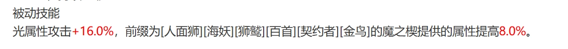 被动技能会让角色的光属性攻击提升16%。若镶嵌了人面狮、契约者、金乌、还要、狮鹫以及白首等魔之楔,该属性还可再增加8% 。