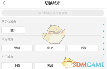 3、要定位成功,可通过界面右侧的首字母,找到自己所在的本地城市,然后选择该城市。