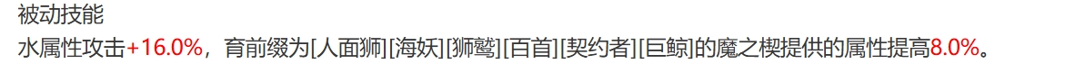 被动技能可使水属性攻击提升16.0%。若具备人面狮、巨鲸、还要、白首、狮鹫以及契约者等魔之契所赋予的属性,还可额外增加8.0%。