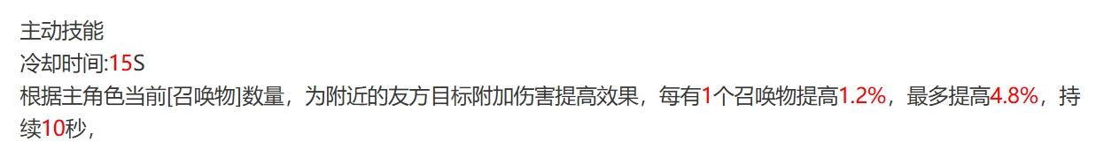 雨衣水滴的主动技能冷却时长为15秒,一旦冷却完毕,技能便会自动施展。此技能依据主人召唤物的数量,来确定给友方附加的伤害百分比。举例而言,若主人召唤出1个召唤物,就能让友方伤害提高1.2%,最高可将伤害提升至4.8%,且伤害提升效果能持续10秒。