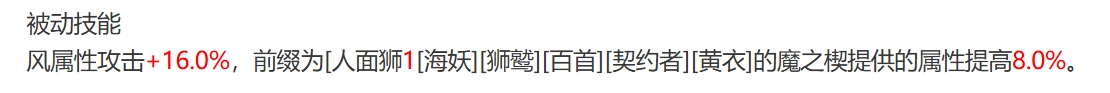 被动技能为提升自身风属性攻击,风属性攻击可增强16.0%。若魔之契的对象是人面狮、白首、还要、黄衣、狮鹫以及契约者,只要具备上述几种属性,属性便能够提升8.0% 。
