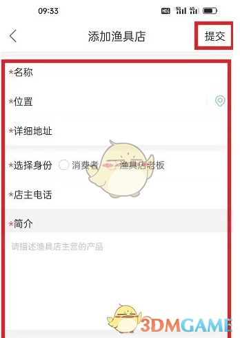 3、当您进入添加渔具店页面,填写完渔具店相关资料后,点击页面右上角的“提交”按钮,就能成功添加渔具店。