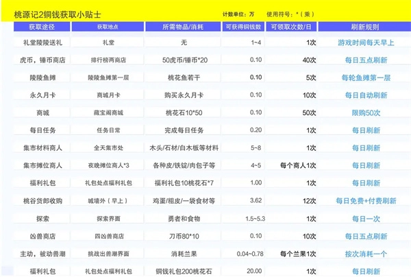 每日铜币必获统计:日常可得2000铜币,商人收购方面,0氪玩家一日约14万铜币(微氪玩家一日约18万铜币),再加上每日集市材料收购所得,以及各摊位材料收购所得,还有每日一次探索的铜币收益 。