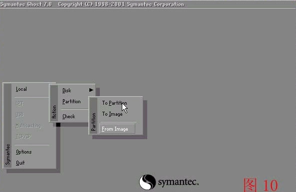 3、 回车后 就会进入GHOST 的操作界面 选择菜单到 Local(本机)--Partition(分区)--From Image(来至镜像)